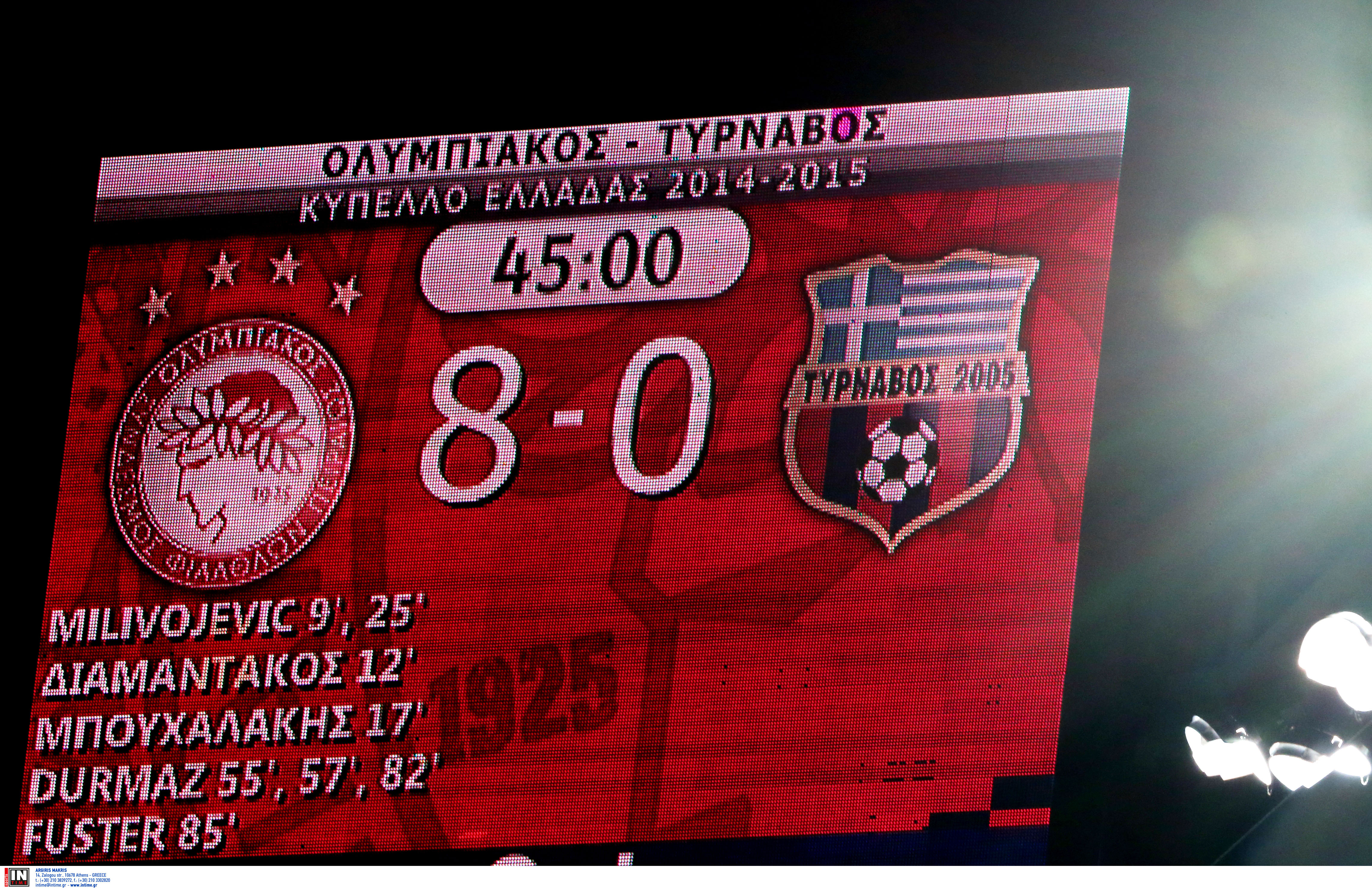 Καταιγιστικός ο Ολυμπιακός, συνέτριψε 8-0 τον Τύρναβο στο «Γεώργιος Καραϊσκάκης» και προκρίθηκε στους προημιτελικούς του Κυπέλλου Ελλάδας.