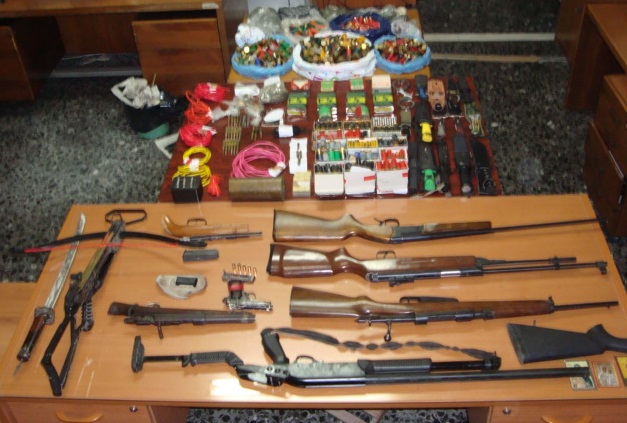 Σε έρευνα στο σπίτι του δράστη, βρέθηκαν επίσης και κατασχέθηκαν δύο πολεμικά τυφέκια, ισάριθμα κυνηγετικά όπλα, αεροβόλο όπλο, πυροβόλο όπλο και γεμιστήρας, 124 φυσίγγια διαφόρων διαμετρημάτων, 118 καψούλια και 151 κάλυκες, 14 μαχαίρια, ξίφος, βαλλίστρα (τόξο), χειροπέδες και γκλοπ, τρεις πυροκροτητές, επτά φιτίλια και κροτίδα.