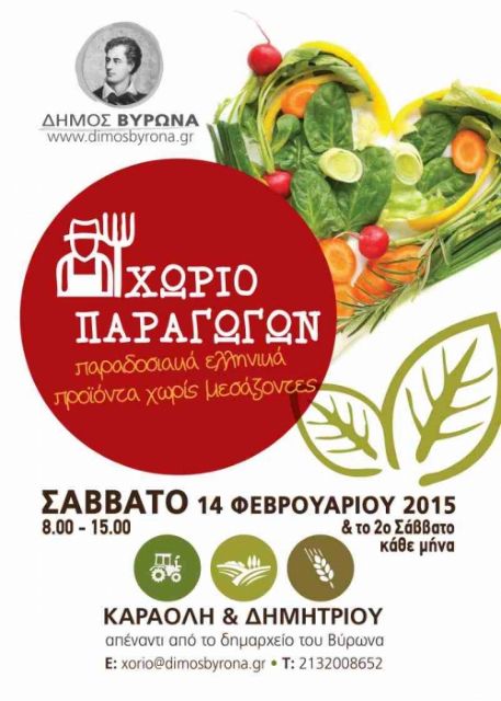 Παραγωγοί από όλη τη χώρα θα διαθέσουν τα προϊόντα τους, χωρίς μεσάζοντες, σε ανταγωνιστικές τιμές, στο «Χωριό Παραγωγών» στο Βύρωνα, το προσεχές Σάββατο 14 Φεβρουαρίου 2015. Οι πολίτες θα μπορούν να προμηθευτούν περισσότερα από 230 ελληνικά προϊόντα, εγγυημένης ποιότητας και με πιστοποίηση ταυτότητας, από συνεταιρισμούς παραγωγών όλης της Ελλάδας, στο πάρκο Καραολή και Δημητρίου, απέναντι από το Δημαρχείο, με ώρες λειτουργίας 08.00 –15.00.
