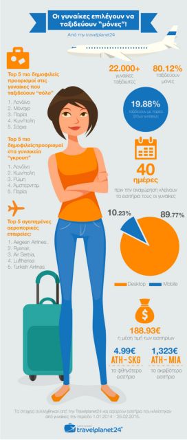 Σε ευρωπαϊκές πόλεις κυρίως και μόνες τους επιλέγουν να ταξιδεύουν στην πλειοψηφία τους οι γυναίκες. Σύμφωνα με τα στοιχεία που παρουσιάζει η Travelplanet24, με αφορμή την Ημέρα της Γυναίκας, περισσότερες από 22.000 κρατήσεις πραγματοποιούνται από γυναίκες ετησίως (1.01.2014 –25.02.2015), για να ταξιδέψουν αεροπορικώς. Από αυτές, το 80% επιλέγουν να ταξιδεύουν μόνες τους ενώ μόλις το 20% με παρέα άλλων γυναικών.