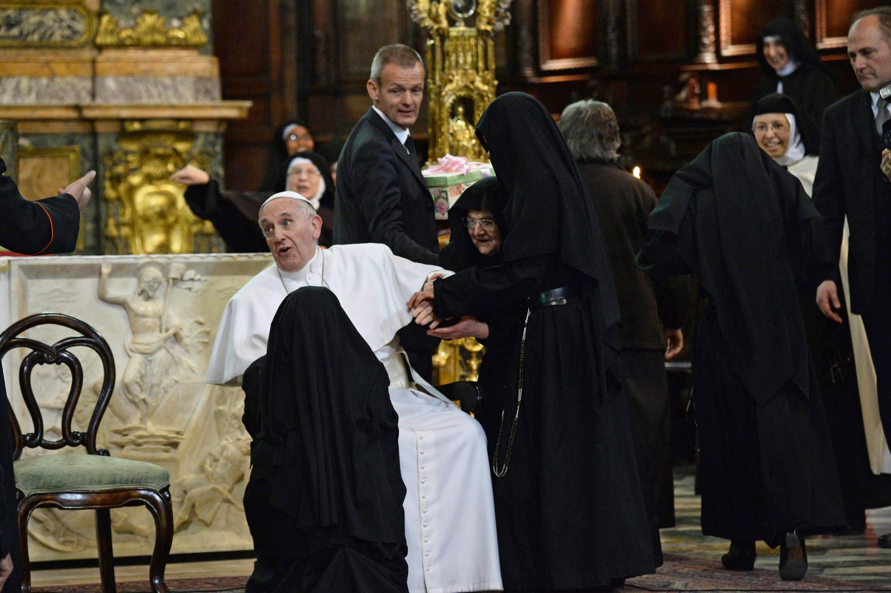 Οι μοναχές που έθεσαν σε… κλοιό τον ποντίφικα γεμίζοντάς τον με δώρα είναι εσώκλειστες -κανονικά βλέπουν όσους επισκέπτες φθάνουν στη μονή τους μέσα από χώρισμα- αλλά έλαβαν ειδική άδεια να παραστούν στην ομιλία που εκφώνησε ο Πάπας στο Καθεδρικό Ναό προς ιερείς και καλόγριες.