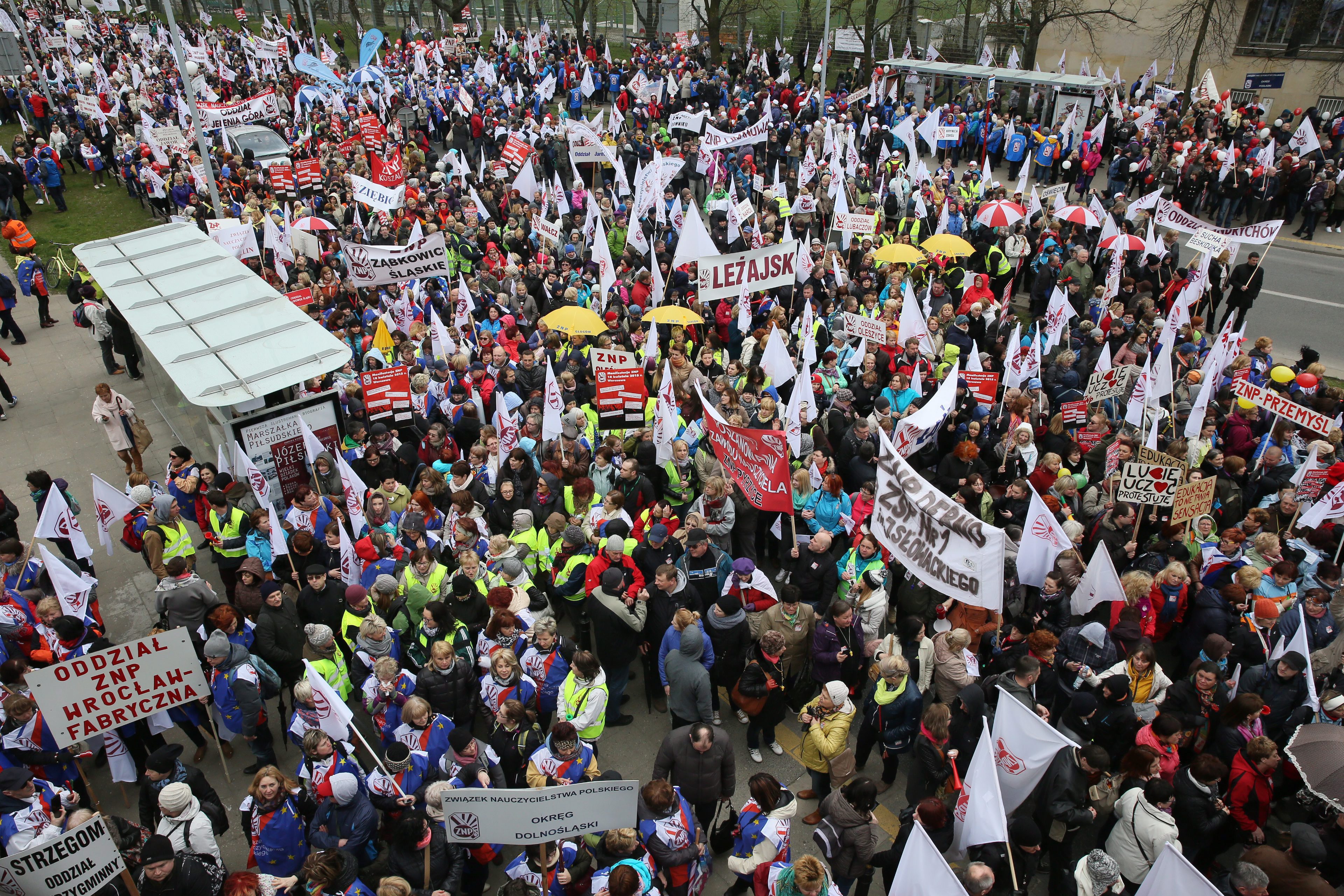 Ανταποκρινόμενοι στην έκκληση των συνδικάτων ZNP και OPZZ, οι διαδηλωτές έφτασαν από όλη την Πολωνία και κρατούσαν πανό με συνθήματα όπως «Ζητάμε αυξήσεις μισθών», «Θέλουμε τον διάλογο», «Στοπ στο κλείσιμο σχολείων».