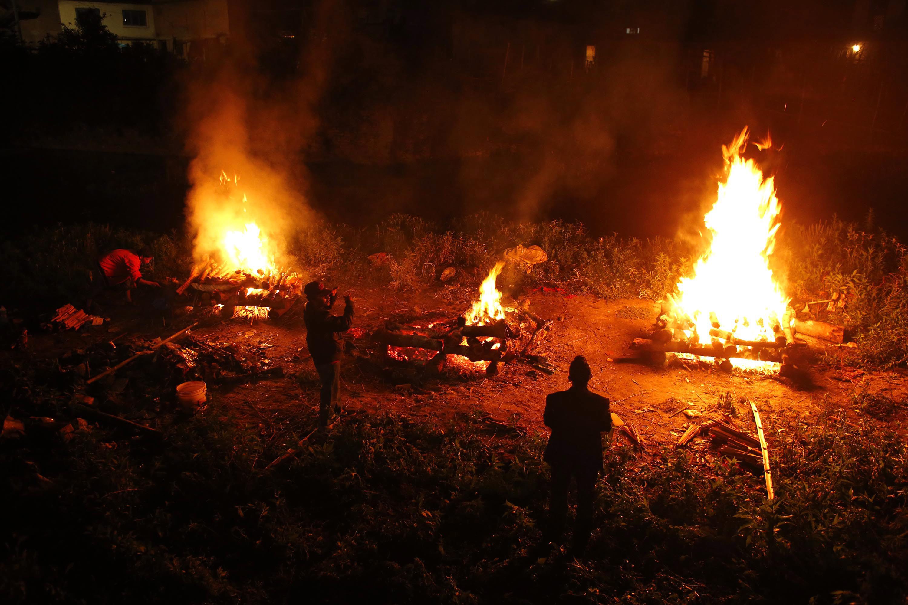 Στο Κατμαντού, οι νεκρικές πυρές συμπληρώνουν το τοπίο με τα άδεια, ακατάλληλα κτίρια, τα ερείπια και τις σκηνές. Οι νεκροί αποτεφρώνονται εδώ και δύο ημέρες, πολλές φορές με την πιο πρόχειρη δυνατή προετοιμασία και ακόμη και σε πλατείες.