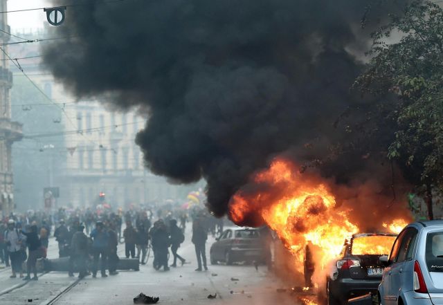 Τα ιταλικά ΜΜΕ, στα οποία από το απόγευμα της Παρασκευής εναλλάσονται τίτλοι όπως «πόλεμος», «ισοπεδωμένοι δρόμοι», «το Μιλάνο διά πυρός και σιδήρου», επιρρίπτουν την ένταση σε μέλη του λεγόμενου «μαύρου μπλοκ».
