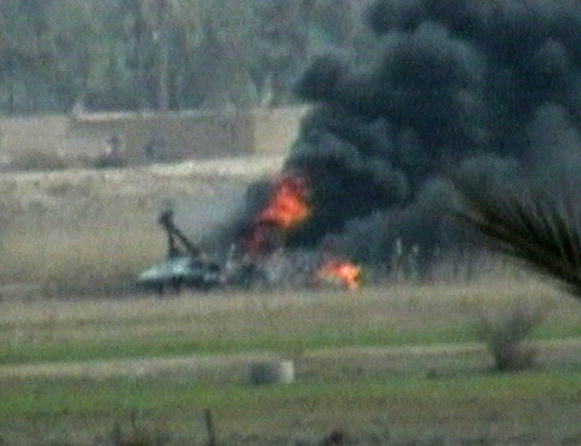 In this image made from video broadcast by AP Television News, Wednesday, Feb. 7, 2007, smoke and flame rise from the crash site of a U.S. military CH-46 Sea Knight helicopter which went down about 30 kilometers (20 miles) northwest of Baghdad, Iraq. Al-Qaida-linked Sunni insurgents claimed responsibility Wednesday for the downing of a U.S. military helicopter northwest of Baghdad. The claim was issued in an Internet statement signed by the Islamic State in Iraq, an umbrella group of several Sunni insurgent groups, including al-Qaida in Iraq. The authenticity of the statement _ posted on a Web forum where the group often issues statements - could not be independently confirmed. The U.S. military did not give the cause of the crash or comment on casualties, though one U.S. military official said there were reportedly fewer than 10 people on board. (AP Photo/APTN) ** TV OUT **