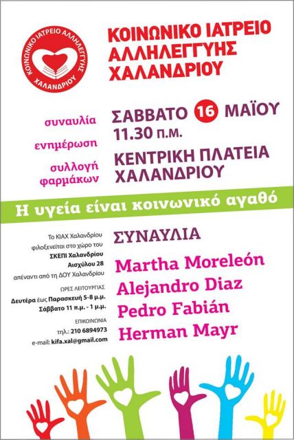 Το Κοινωνικό Ιατρείο Αλληλεγγύης Χαλανδρίου (KIAX) διοργανώνει εκδήλωση ενημέρωσης, συλλογής φαρμάκων και παράλληλα συναυλία στην Κεντρική Πλατεία του Χαλανδρίου το Σάββατο 16 Μαΐου 2015. Με σύνθημα «Η υγεία είναι κοινωνικό αγαθό» η εκδήλωση θα ξεκινήσει στις 11.30, ενώ στη συναυλία θα συμμετέχουν οι καλλιτέχνες Martha Moreleόn, Αlejandro Diaz, Pedro Fabián και Herman Mayr.