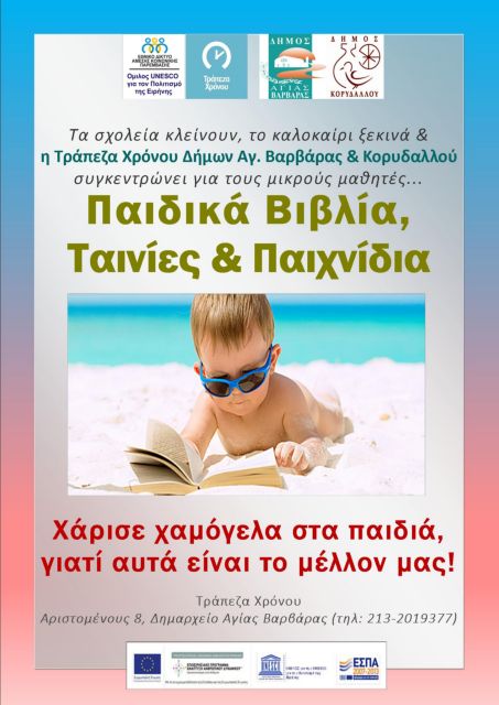 Με τη φετινή σχολική χρονιά να φτάνει στο τέλος της, η Τράπεζα Χρόνου Δήμων Αγίας Βαρβάρας και Κορυδαλλού διοργανώνει συλλογή βιβλίων, ταινιών και παιχνιδιών για τους μικρούς της φίλους, ώστε να τους συντροφεύουν δημιουργικά στις καλοκαιρινές τους διακοπές. Η Τράπεζα Χρόνου του Ομίλου Unesco για τον Πολιτισμό της Ειρήνης, στο πλαίσιο των δομών για την αντιμετώπιση της φτώχειας, αναλαμβάνει τη συγκέντρωση, την επιμέλεια και τη διανομή δωρηθέντων παιδικών βιβλίων, ταινιών και παιχνιδιών.