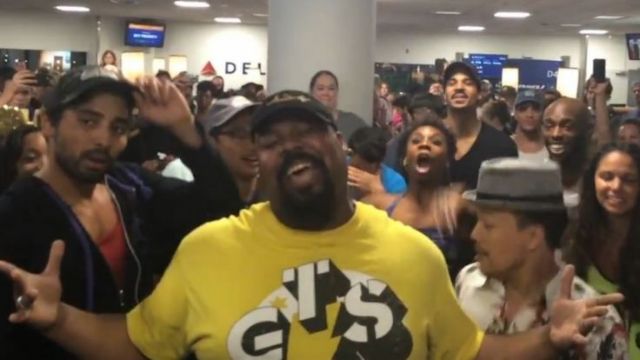 Η… «μάχη» συνεχίστηκε με ένα ακόμα τραγούδι από τους συντελεστές του «Βασιλιά των Λιονταριών». Εν τω μεταξύ, όλο και περισσότεροι επιβάτες των πτήσεων μαζεύονταν για να απολαύσουν το αναπάντεχο θέαμα, ξεχνώντας για λίγο την κούραση και την ανία τους.