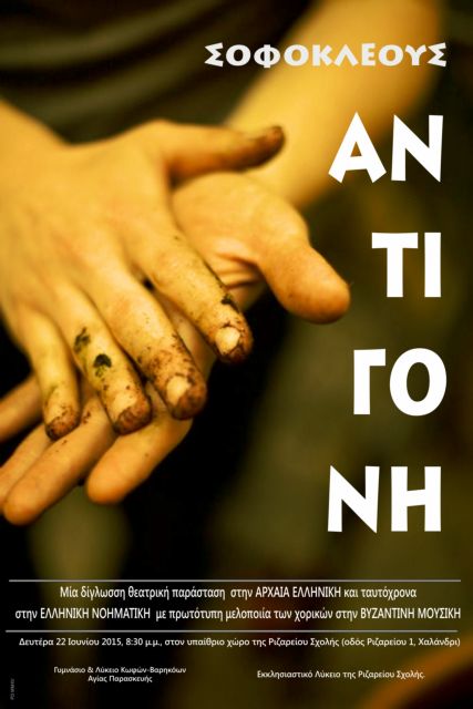 Υπό την αιγίδα της η UNESCO έχει τεθεί η δίγλωσση παράσταση της «Αντιγόνης» του Σοφοκλή (σε αρχαία ελληνικά και ελληνική νοηματική) που θα δοθεί την Δευτέρα 22 Ιουνίου στον προάυλιο χώρο του Εκκλησιαστικού Λυκείου της Ριζαρείου Σχολής.