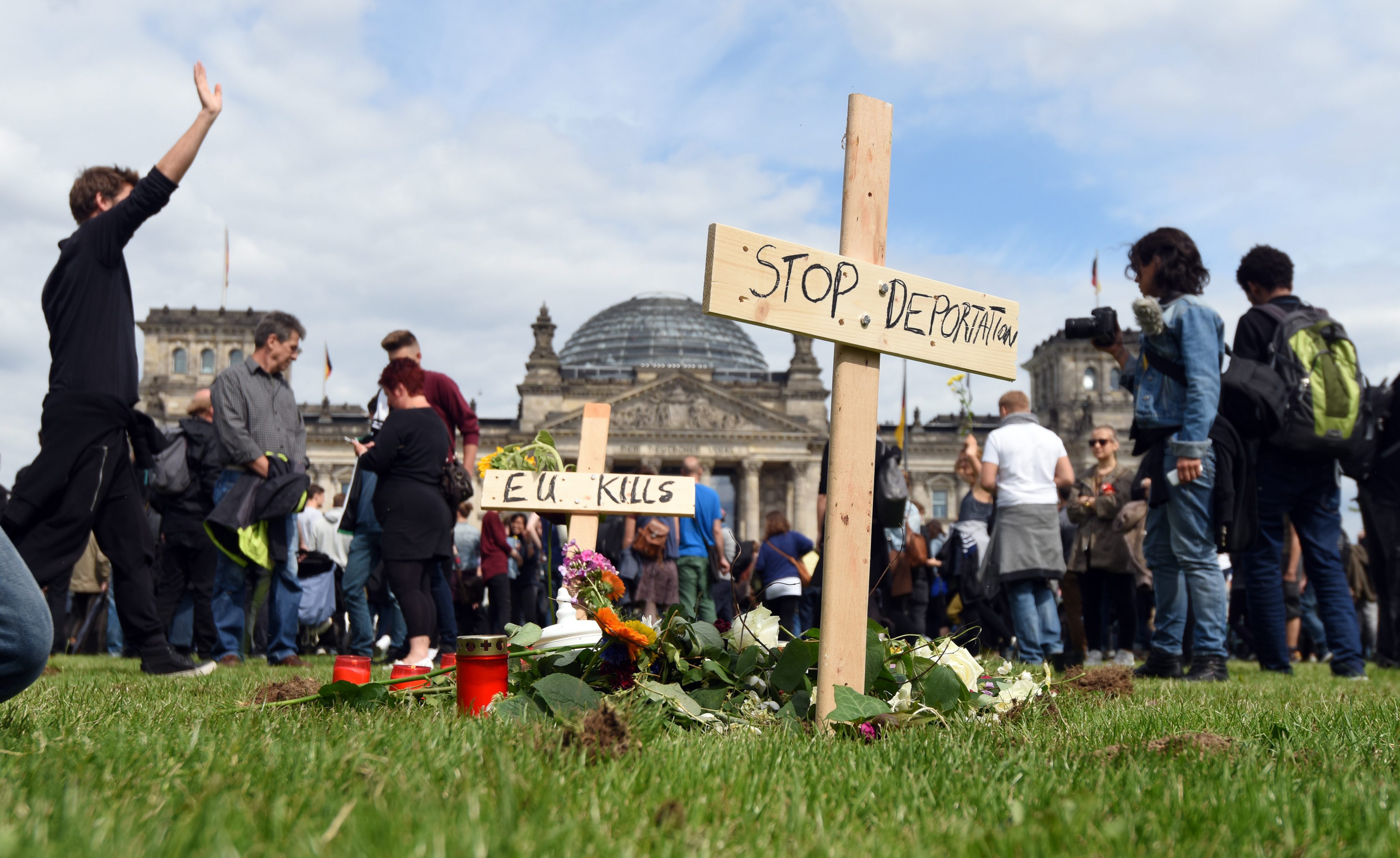 Περίπου 5.000 άτομα έδωσαν το «παρών» σε διαμαρτυρία μπροστά στη γερμανική Βουλή για την στάση της ΕΕ απέναντι στη μεταναστευτική κρίση: Επίκεντρο της κινητοποίησης ήταν η ταφή τριών φερέτρων στην πλατεία μπροστά από το Μπούντεσταγκ, ως φόρος τιμής στους χιλιάδες που πνίγονται ανώνυμα στη Μεσόγειο.