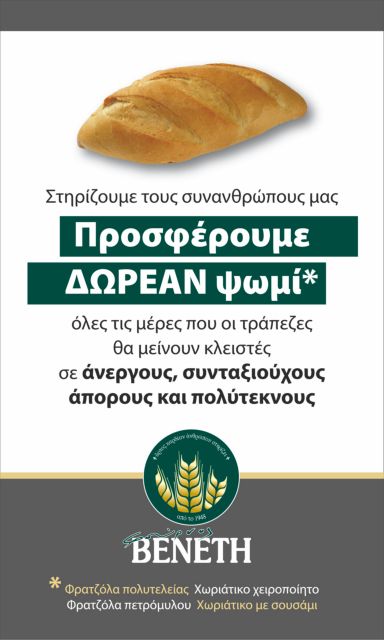 Δωρεάν ψωμί σε συνταξιούχους, άπορους, άνεργους και πολύτεκνους συμπολίτες μας, προσφέρει από αύριο, Παρασκευή 3 Ιουλίου 2015, ο «ΦΟΥΡΝΟΣ ΒΕΝΕΤΗ» υποστηρίζοντας την ελληνική οικογένεια, σε αυτή την δύσκολη οικονομική στιγμή. Ειδικότερα, σε όλα τα καταστήματα του δικτύου ΒΕΝΕΤΗ, θα μπορούν να προμηθευτούν δωρεάν ψωμί από αύριο το πρωί και καθ’ όλο το διάστημα μέχρι να επαναλειτουργήσουν οι τράπεζες και να ομαλοποιηθεί η κατάσταση στην αγορά και στις ελληνικές οικογένειες.