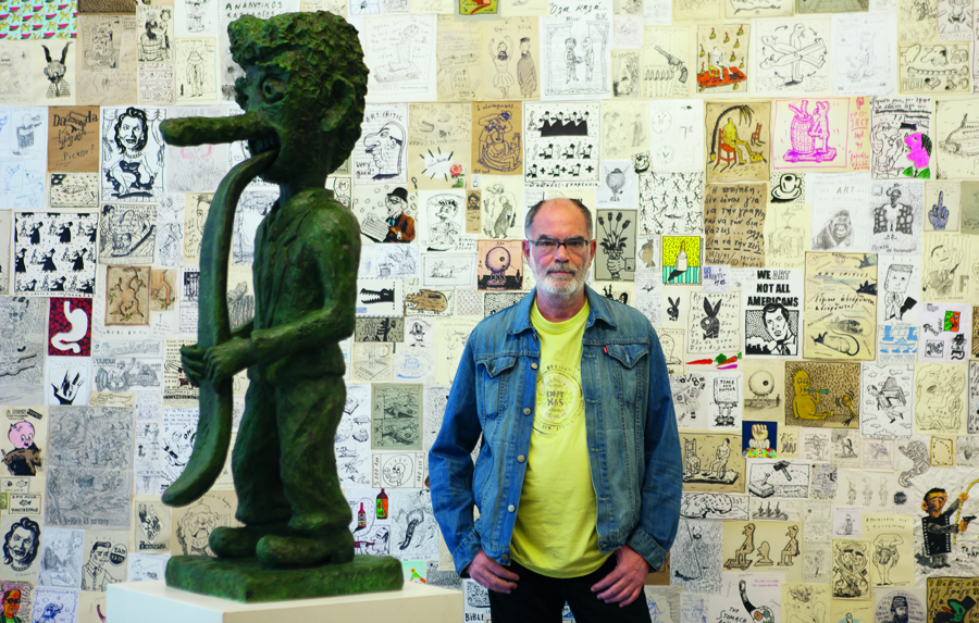 Στην γκαλερί Καλφαγιάν η έκθεση «Phantasmagoria» του Τάσου Παυλόπουλου συστήνεται ως μια «παρανοϊκή» εγκατάσταση. Ο δημιουργός των έργων στέκεται ωστόσο ανάμεσα στα έργα με τις πιθηκόμορφες φιγούρες και σε έναν τοίχο γεμάτο παλιά σκίτσα, «ακόμη και τριαντακονταετίας, τη σαβούρα της τέχνης», σοβαρός, έχοντας εμφανέστατα σώας τας φρένας. «Είναι ο χαρακτήρας μου έτσι, δεν είμαι κανένας θεότρελος σαν τον Μπενίνι που εμφανίζεται και κάνει κωλοτούμπες. Οσοι με ξέρουν μόνο από τη δουλειά μου και με γνωρίζουν για πέντε λεπτά λένε “καμία σχέση!”. Περίμεναν να είμαι τρελός και παλαβός και με βρίσκουν πιο σοβαρό». Εχοντας μεγαλώσει με τα «Κλασσικά Εικονογραφημένα», τον Καραγκιόζη, τα «Μίκυ Μάους», τον Τσάρλι Τσάπλιν, τον Χονδρό και τον Λιγνό, σε αλάνες, σε σπίτια με αυλές, με την Τσινετσιτά, με Τσίτσο και Φράνκο, «με παραλογοτεχνία και με παραφιλολογία», όπως λέει, είναι παιδί της εποχής της αθωότητας τη δεκαετία του ’60. Η ταινία «Οι εντιμότατοι φίλοι μου» είναι μία από τις πολύ αγαπημένες του. Οταν συναντηθήκαμε, ήταν στενοχωρημένος γιατί την προηγούμενη ημέρα είχε μάθει ότι ένας φίλος του αντιμετώπιζε ένα σοβαρό πρόβλημα υγείας. «Το είπα αμέσως σε έναν άλλον κολλητό φίλο και του είπαμε ότι καθώς θα περιμένουμε τα αποτελέσματα των εξετάσεών του θα κάνουμε μια σύσκεψη όλοι οι “εντιμότατοι φίλοι” φορώντας ιατρικές ρόμπες και, αν είναι τα πράγματα χάλια, θα τον πάρουμε να τον πάμε στο νεκροταφείο να αναπαραστήσουμε τη σκηνή από την ταινία. Θα τρελαθούμε αν δεν αντιμετωπίσουμε κάποια πράγματα με χιούμορ. Είναι η μεγαλύτερη άμυνα για την ψυχική μας υγεία».