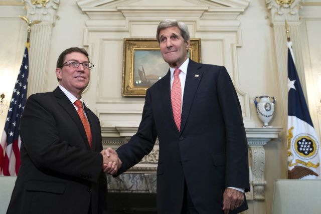 Ο υπουργός Εξωτερικών των ΗΠΑ Τζον Κέρι υποδέχτηκε σήμερα, Δευτέρα, τον ομόλογό του της Κούβας, τον Μπρούνο Ροντρίγκες, στο Στέιτ Ντιπάρτμεντ, στην πρώτη επίσημη επίσκεψη Κουβανού υπουργού Εξωτερικών στην Ουάσινγκτον από το 1958.