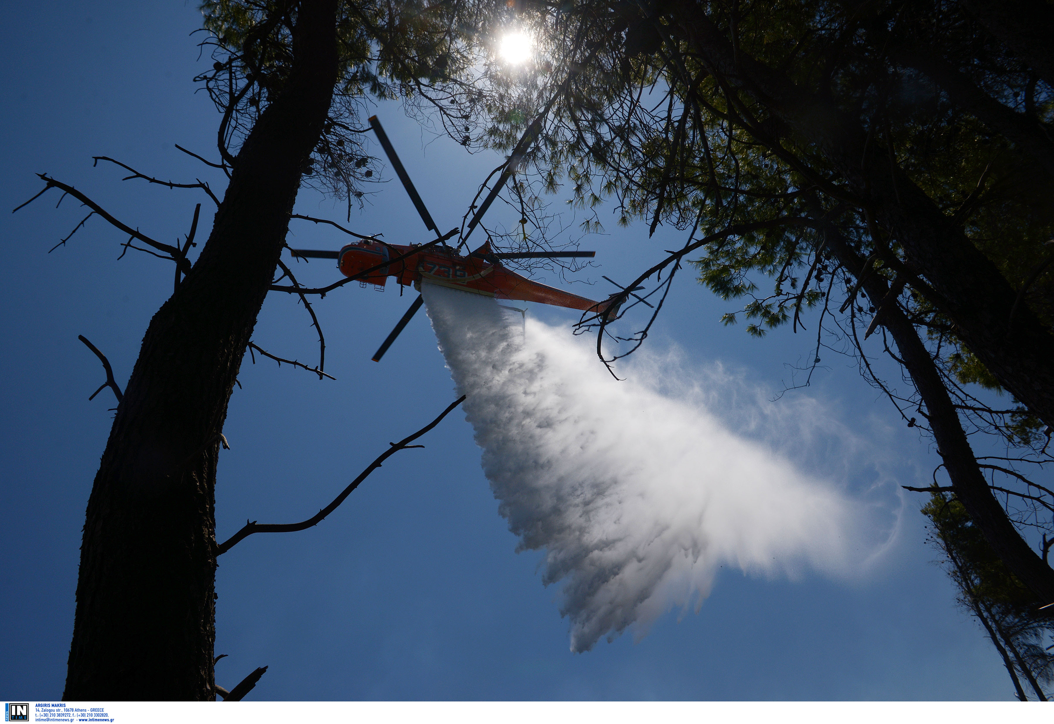 Επί τόπου επιχειρούν 30 πυροσβέστες με 9 οχήματα, ενώ ρίψεις νερού από αέρος εκτελεί ένα ελικόπτερο.
