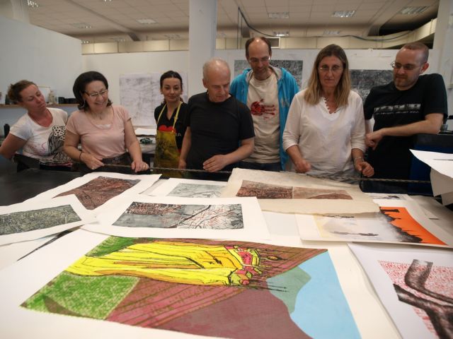 Η χαρακτική είναι όντως συνωμοτική καλλιτεχνική έκφραση. Γύρω μας νεανικά πρόσωπα, με μαύρα από το μελάνι χέρια, σκύβουν με ερωτική ένταση πάνω από τα σκληρά και «σκοτεινά» υλικά για να βγάλουν το πιο φωτεινό και αισιόδοξο μαύρο, αυτό που μόνο η χαρακτική μπορεί να δώσει. Οξυγραφία σε τσίγκο, γραμμική ακουατίντα, μελάνι-ζάχαρη, ανοιχτή οξείδωση. Πώς ένας χάρτης γίνεται εικαστικό αίτημα; Και πώς η τέχνη μπορεί να προτείνει εφαρμοσμένες λύσεις; Μια μεγάλη πινελιά του Κανούτο Καλάν πάνω στο έργο που έκανε στη συνάντηση εργασίας στο Πανεπιστήμιο Καλών Τεχνών Μιμάρ Σινάν της Πόλης, οι συνεργαζόμενοι τούρκοι αρχιτέκτονες τη μετέφρασαν σε μια παραλιακή μεγάλη λεωφόρο. «Αυτό για εμάς ήταν αποκάλυψη» λέει η Βίκυ Τσαλαματά. «Η χαρακτική συνομιλεί. Μέσω του τυπώματος και της χάραξης κάνουμε διαφορετικές παραλλαγές. Φεύγουμε από το τιράζ και πάμε στο αυτόνομο τύπωμα. Το μονότυπο. Δεν αντέχω και η ίδια να κάνω όμοια πράγματα. Με πνίγουν».