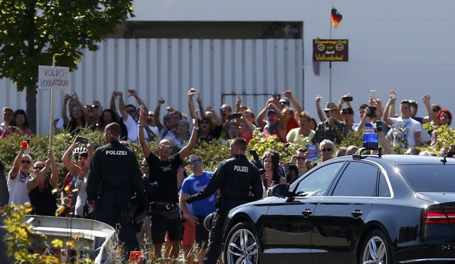Η Μέρκελ ταξίδεψε στο Χάιντεναου, μικρή πόλη στα ανατολικά σύνορα της Γερμανίας με την Τσεχία, για να εκφράσει την υποστήριξή τους προς τους πρόσφυγες μετά τη ρατσιστική βία ακροδεξιών και νεοναζί το Σαββατοκύριακο.