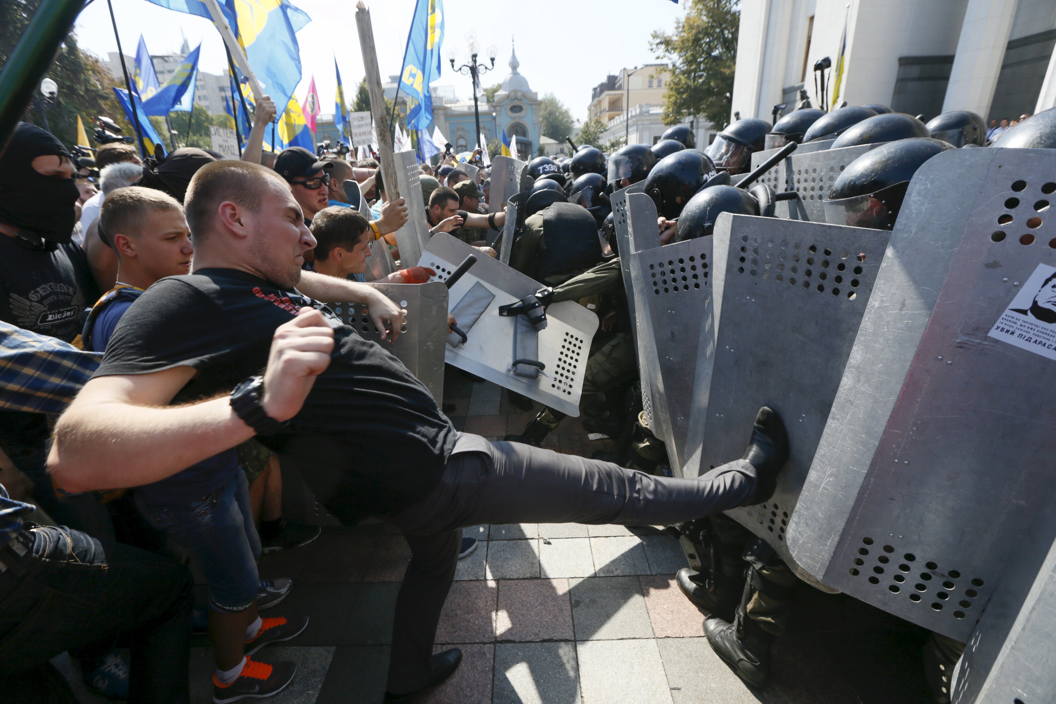 Σφοδρές συγκρούσεις μεταξύ διαδηλωτών και αστυνομικών ξέσπασαν στο Κίεβο, αφότου το Κοινοβούλιο ενέκρινε σχέδιο συνταγματικής μεταρρύθμισης, την οποία απαιτούσαν οι Δυτικοί και αποδίδει περισσότερη αυτονομία στις εξεγερμένες φιλορωσικές ανατολικές περιοχές. Ένας άνδρας της εθνικής φρουράς σκοτώθηκε από σφαίρα στην καρδιά και τουλάχιστον 100 άλλοι τραυματίστηκαν από έκρηξη ρουκέτας που εκσφενδονίστηκε από το πλήθος κατά του κλοιού των δυνάμεων ασφαλείας έξω από τη Βουλή.