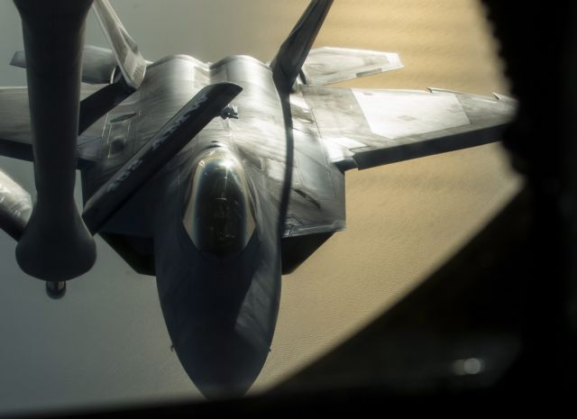 epa04612593 A handout picture made available by the US Department of Defense (DOD) on 10 February 2015 shows an F-22 Raptor, departed from Tyndall Air Force Base, Florida, USA, being refueled by a KC-135 Stratotanker on their way to Iraq, 30 January 2015. The F-22s are supporting the US lead coalition against Islamic State (IS or ISIS). EPA/US AIR FORCES CENTRAL COMMAND/SGT. PERRY ASTON Chelsea Browning, SSgt, USAF NCOIC of Media Operations AFCENT PA chelsea.browning@afcent.af.mil DSN 436-4025 via DVIDS HANDOUT EDITORIAL USE ONLY (File: 14983251.jpg )