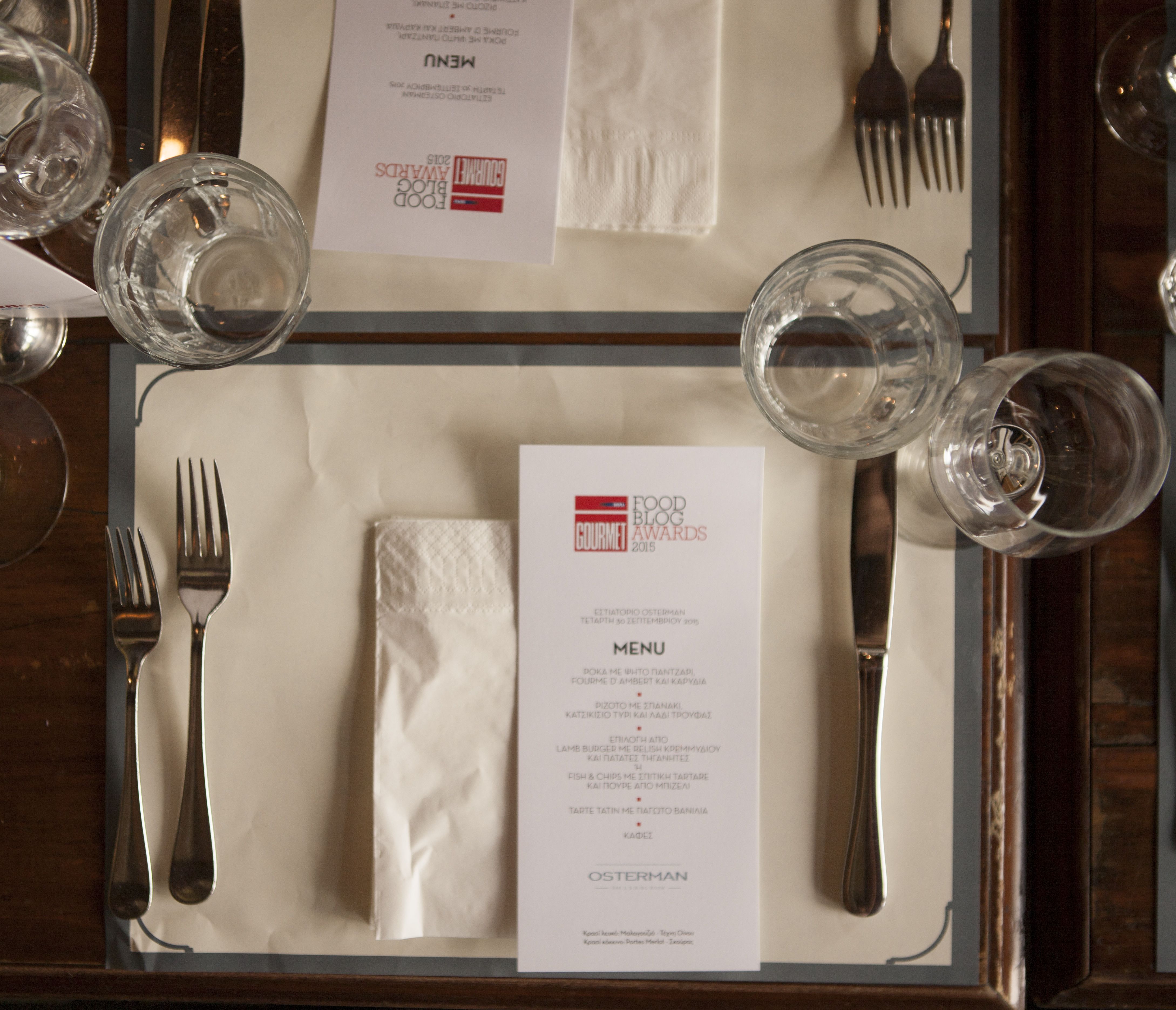 Στα κομψά τραπέζια του Οsterman τα πιάτα άρχισαν να σερβίρονται. Σαλάτα ρόκα με ψητό παντζάρι, ριζότο με σπανάκι, κατσικίσιο τυρί και λάδι τρούφας, ενώ για το κύριο πιάτο οι θαμώνες είχαν να διαλέξουν μεταξύ ενός λαχταριστού lamp burger με relish κρεμμυδιού και πατάτες τηγανιτές, αλλά και μιας χορταστικής μερίδας fish & chips με σπιτική tartare και πουρέ από μπιζέλι. Οι bloggers καθισμένοι σε ομάδες ανάλογα με την κατηγορία που διαγωνίζονται (Best cooking blog, Best sweet treats, Best baking, Best traditional recipies, Best family cooking, Best special diet, Best Greek cooking in English, Best design and site architecture) είχαν την ευκαιρία να συνομιλήσουν μεταξύ τους, αλλά και με τους χορηγούς του διαγωνισμού από τα brands Κnorr, Flora με βούτυρο, Bιτάμ, ΑΒ Βασιλόπουλος, Αegean και ΙΚΕΑ.