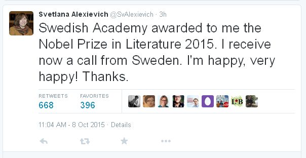 Συγκεκριμένα στις 12.00 την Τετάρτη λογαριασμός στο Twitter, που έφερε το όνομα της λευκορωσίδας δημοσιογράφου, δημοσίευσε tweet που έγραφε: «Η Σουηδική Ακαδημία με βράβευσε με το βραβείο Νομπέλ Λογοτεχνίας. Είμαι ευτυχισμένη. Πολύ ευτυχισμένη. Ευχαριστώ».