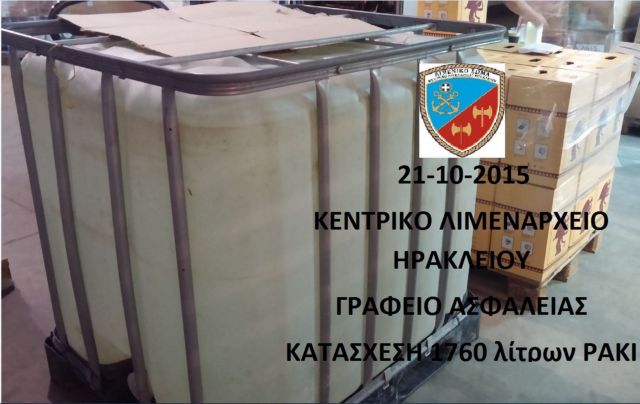 Ένας 41χρονος συνελήφθη το βράδυ της Τετάρτης από στελέχη του λιμεναρχείου Ηρακλείου Κρήτης «διότι σε γενόμενο έλεγχο σε ΦΔΧ οχήματος με επικαθήμενο, του οποίου ήταν οδηγός, βρέθηκαν διάφορες συσκευασίες που περιείχαν αλκοολούχο ποτό “ρακί” χαρακτηριζόμενο ως εύφλεκτο υγρό κλάσης 3, συνολικής ποσότητας 1.760 λίτρων, κατά παράβαση του Κανονισμού φόρτωσης, εκφόρτωσης, διακίνησης και παραμονής επικίνδυνων ειδών σε λιμένες και μεταφορά αυτών δια θαλάσσης και του άρθρου 291 του Ποινικού Κώδικα “Διατάραξη της ασφάλειας σιδηροδρόμων, πλοίων και αεροσκαφών”».