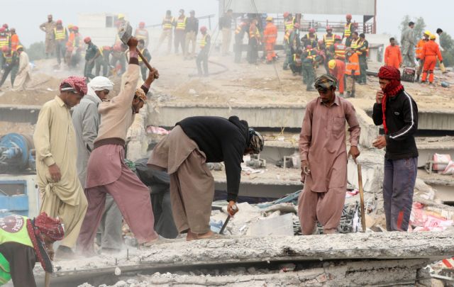 Μετά την κατάρρευση του εργοστασίου την Τετάρτη το βράδυ περίπου 100 άνθρωποι έχουν ανασυρθεί ζωντανοί από το τετραώροφο εργοστάσιο που κατασκεύαζε σακούλες πολυαιθυλενίου και βρισκόταν στη βιομηχανική ζώνη Σούνταρ, περίπου 45 χιλιόμετρα από το κέντρο της Λαχώρης.