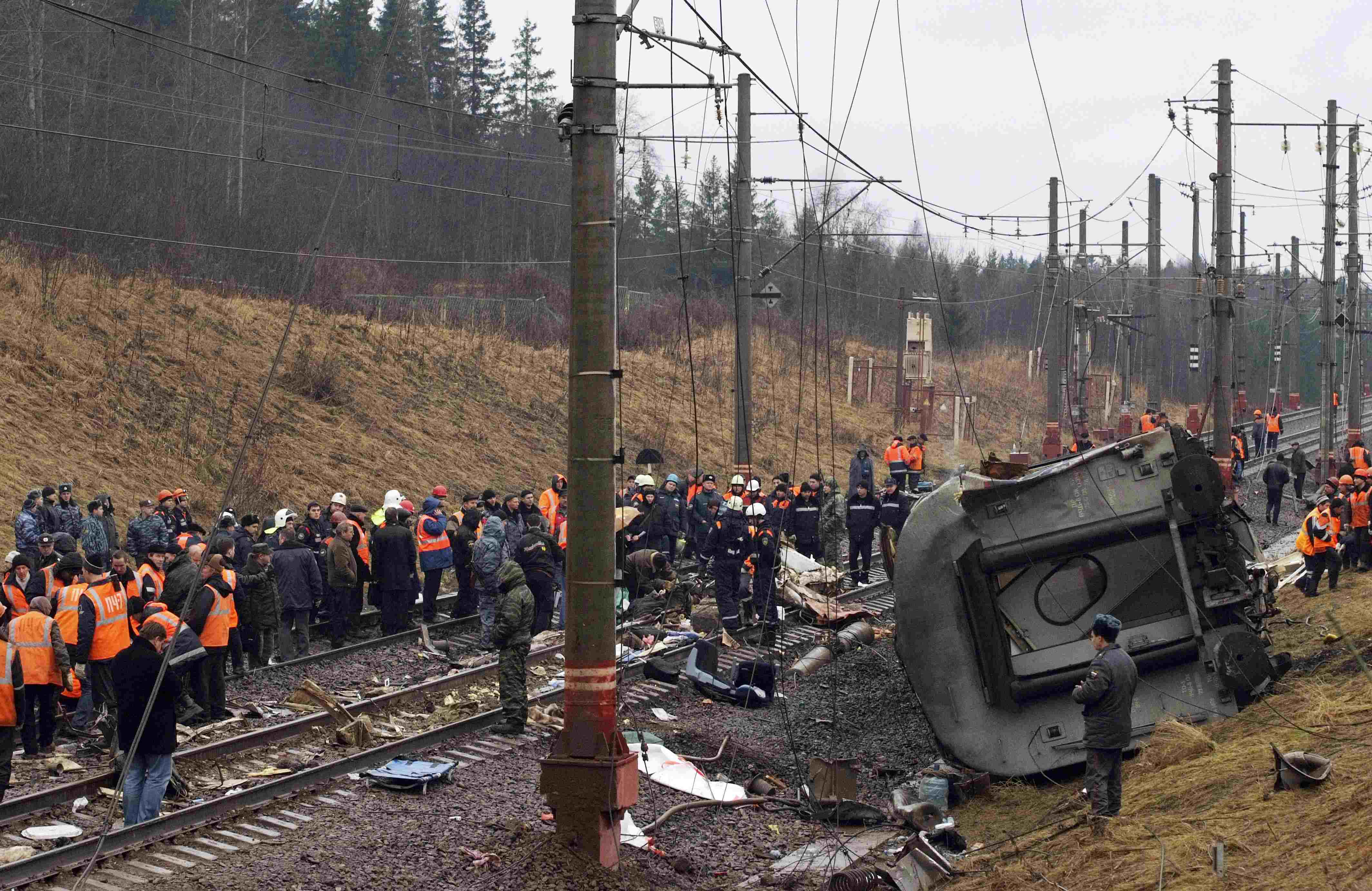 A general view shows the site of the Nevsky Express train derailment near the village of Uglovka, about 400 km (249 miles) northwest of Moscow, November 28, 2009. A bomb caused a Russian train crash that killed dozens of people and injured 100 more, officials said on Saturday, stoking fears of an upsurge in attacks in Russia's heartland. Picture taken November 28, 2009. REUTERS/Konstantin Chalabov (RUSSIA CRIME LAW DISASTER TRANSPORT)
