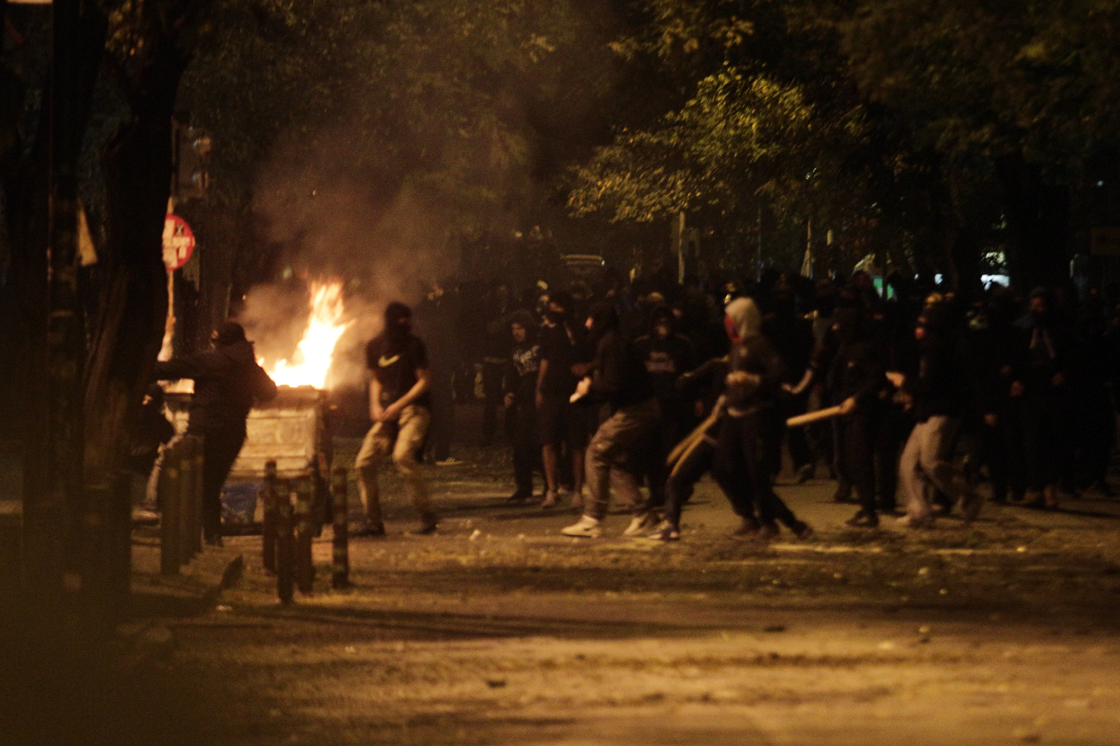 Αντιεξουσιαστές πετάνε μολότοφ, πέτρες και ξύλα σε διμοιρίες των ΜΑΤ σε επεισόδια που σημειώθηκαν γύρω από το Πολυτεχνείο μετά το τέλος της πορείας για τον εορτασμό της 42ης επετείου από την εξέγερση του Πολυτεχνείου, στην Αθήνα, Τρίτη 17 Νοεμβρίου 2015. Περίπου 200 άτομα πραγματοποίησαν επιθέσεις με μολότοφ, πέτρες και ξύλα σε διμοιρίες των ΜΑΤ, στις οδούς Στουρνάρη και Μπουμπουλίνας, ενώ αναποδογύρισαν και έκαψαν κάδους απορριμμάτων. ΑΠΕ ΜΠΕ/ΑΠΕ ΜΠΕ/ΑΛΕΞΑΝΔΡΟΣ ΒΛΑΧΟΣ (File: 15973344.JPG )