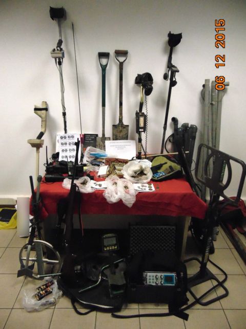 Βρέθηκαν επίσης 128 αντικείμενα, κυρίως μολύβδινα, τα οποία χρειάζονται περαιτέρω διερεύνηση, έξι ανιχνευτές μετάλλων, δύο δίσκοι ανίχνευσης, τρεις φορητοί ασύρματοι κι ένας ασύρματος αυτοκινήτου, πολεμικό τυφέκιο, δύο πιστόλια κρότου και ένα αερίου, διόπτρα, οκτώ βλήματα πολεμικού όπλου, εκατοντάδες φυσίγγια διαφόρων διαμετρημάτων, κροτίδες, πλήθος βιβλίων και σημειώσεων με πληροφορίες για αρχαία νομίσματα και δύο συλλογές αντιγράφων αρχαίων νομισμάτων.