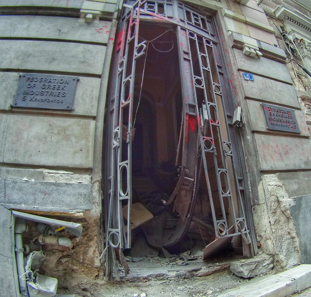Η είσοδος στο κτήριο του Συνδέσμου Ελληνικών Βιομηχανιών(ΣΕΒ), στην οδό Ξενοφώντος στο Σύνταγμα την Τετάρτη 25 Νοεμβρίου 2015, μια ημέρα μετά την έκρηξη βόμβας που είχαν τοποθετήσει άγνωστοι. Στο σημείο που έγινε η έκρηξη, άνοιξε κρατήρας, ενώ έχει υποστεί μεγάλες ζημιές η πρόσοψη των γραφείων του ΣΕΒ. Παράλληλα, σοβαρές υλικές ζημιές έχουν προκληθεί στην πρεσβεία της Κύπρου που βρίσκεται ακριβώς απέναντι, καθώς και σε ξενοδοχείο από την πλευρά της οδού Ξενοφώντος.