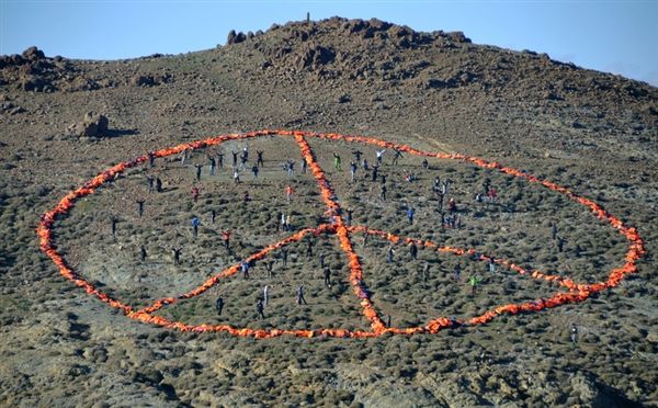 Μέλη της Greenpeace, των Γιατρών Χωρίς Σύνορα και άλλων οργανώσεων που δραστηριοποιούνται στην υποδοχή προσφύγων στη Λέσβο, σχημάτισαν το σήμα της ειρήνης χρησιμοποιώντας 3.000 σωσίβια προσφύγων που έχουν φτάσει στο νησί.