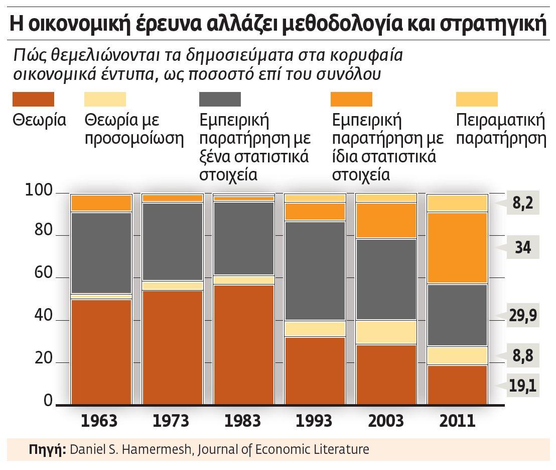 Ο ρεπόρτερ του αμερικανικού πρακτορείου αναφέρεται σε μελέτη του καθηγητή Οικονομίας στο Πανεπιστήμιο του Τέξας Ντάνιελ Χάμερμες που δημοσιεύθηκε στα «American Economic Review», «Journal of Political Economy» και «Quarterly Review of Economics». Σύμφωνα με αυτήν, τα άρθρα που δημοσιεύονται στα προαναφερθέντα επιστημονικά περιοδικά και στις κορυφαίες οικονομικές εφημερίδες του πλανήτη βασίζονται τις τελευταίες δεκαετίες όλο και περισσότερο στην εμπειρική παρατήρηση και όλο και λιγότερο στην επιστημονική θεωρία.