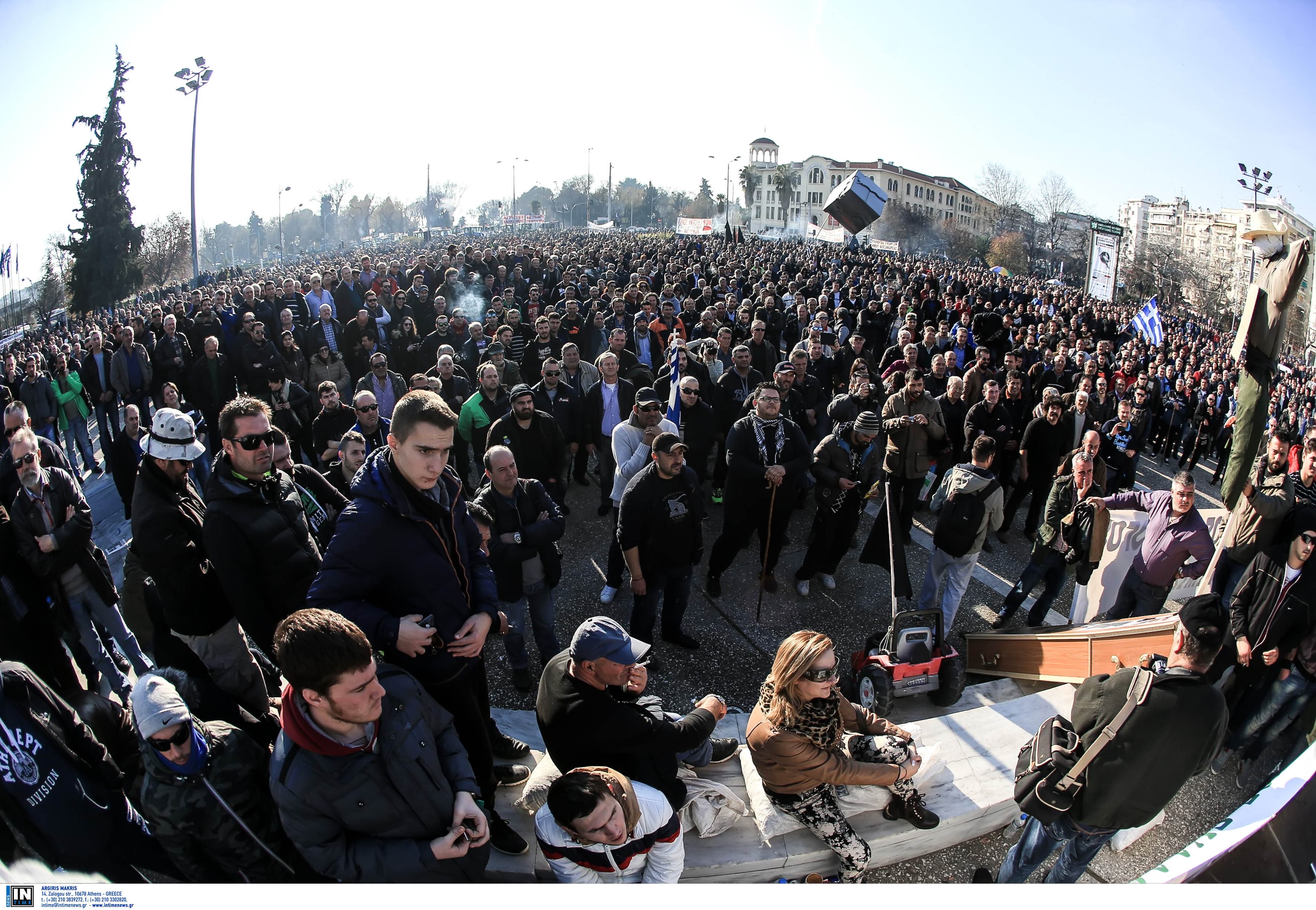 Δυναμικό «παρών» έδωσαν την Πέμπτη αγρότες, κτηνοτρόφοι και αλιείς από 75 μπλόκα, στο συλλαλητήριο που έγινε στην καρδιά της Θεσσαλονίκης, με αφορμή την προγραμματισμένη τελετή εγκαινίων της 26ης Agrotica, που τελικά ματαιώθηκε. Τα εγκαίνια είχαν προγραμματιστεί να τελεστούν από τον υπουργό Αγροτικής Ανάπτυξης και Τροφίμων, Ευάγγελο Αποστόλου, με προσκεκλημένους περισσότερα από 1.000 άτομα στο συνεδριακό κέντρο Ιωάννης Βελλίδης, στο οποίο υπάρχει πρόσβαση από τρεις πλευρές.Οι εκτιμήσεις κάνουν λόγο για 15-20 χιλιάδες διαδηλωτές.