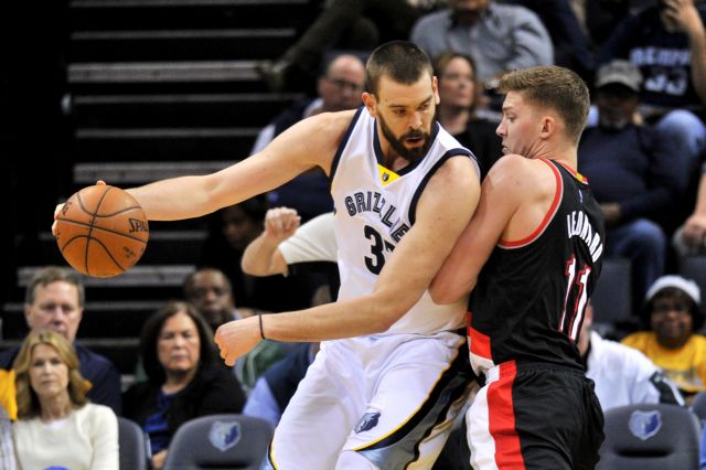 Memphis Grizzlies center Marc Gasol, left, controls the ball against Portland Trail Blazers forward Meyers Leonard (11) in the first half of an NBA basketball game Monday, Feb. 8, 2016, in Memphis, Tenn. (AP Photo/Brandon Dill) (File: Trail Blazers Grizzlies Basketball.JPEG-0ef3b.jpg )