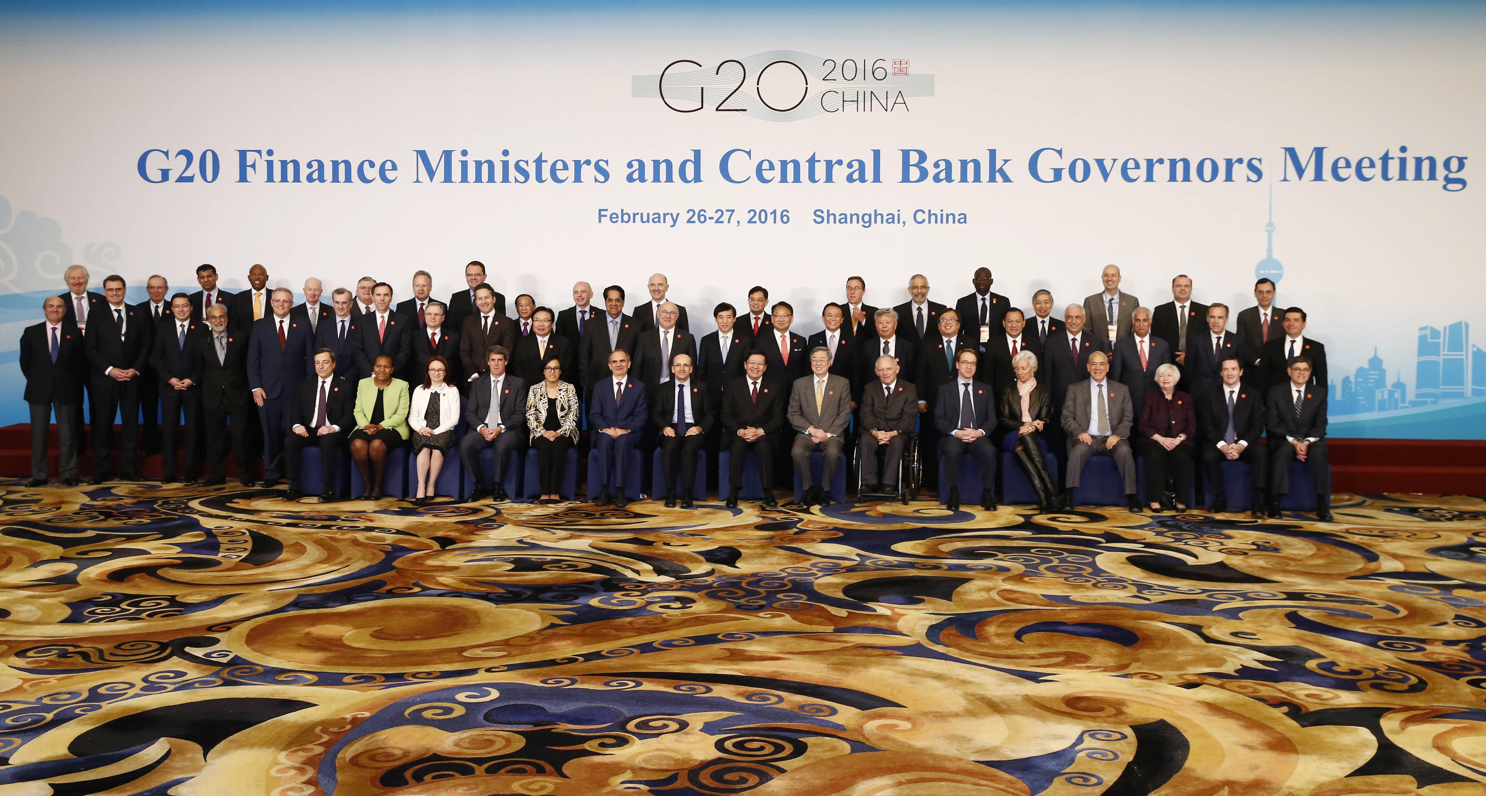 Officials led by host country officials Chinese Finance Minister Lou Jiwei, center left in front, and People's Bank of China Governor Zhou Xiaochuan, center right in front, pose for a family photo of G20 Finance Ministers and Central Bank Governors Meeting at the Pudong Shangri-la Hotel in Shanghai, Saturday, Feb. 27, 2016. (Rolex Dela Pena/Pool Photo via AP) (File: China G20 Finance Meeting.JPEG-07d2e.jpg )