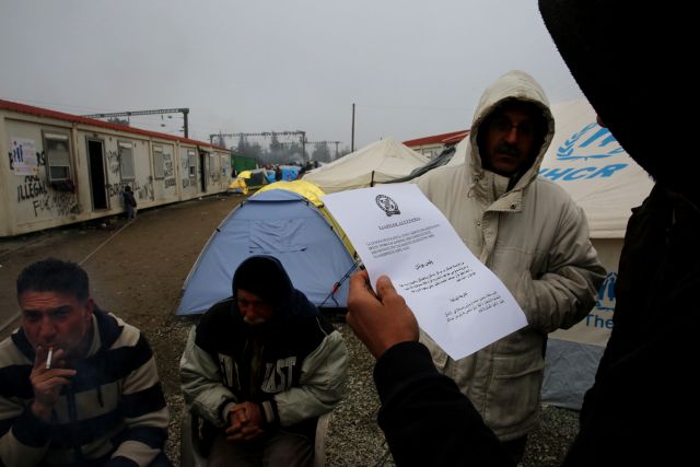 Το φυλλάδιο ενημερώνει τους πρόσφυγες στην Ειδομένη πως τα σύνορα, έχουν κλείσει και τους καλεί να μεταβούν στους χώρους φιλοξενίας όπου θα βρουν τροφή και στέγη.
