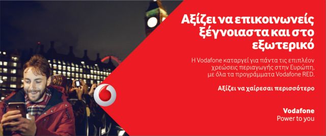 Για πρώτη φορά στην Ελλάδα, καταργούνται για πάντα οι χρεώσεις περιαγωγής σε όλα τα προγράμματα Vodafone Red, προσφέροντας τη δυνατότητα στους συνδρομητές της εταιρείας να χρησιμοποιούν το πρόγραμμα τους, χωρίς καμία επιπλέον χρέωση, σε όλες τις χώρες της Ευρωπαϊκής Ένωσης.