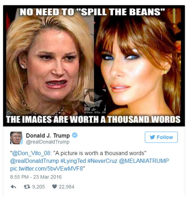 Εξαλλος επειδή κυκλοφόρησε ημίγυμνη φωτογραφία της δικής του γυναίκας Μελάνια, ο Τραμπ απείλησε στο Twitter ότι θα «τα αποκαλύψει όλα» για την Χάϊντι, πρώην στέλεχος της Goldman Sachs. Και κυκλοφόρησε μια διόλου κολακευτική φωτογραφία της Χάϊντι, πλάι σε μια φωτογραφία της πανέμορφης Μελάνια, γράφοντας στη λεζάντα «μια εικόνα αξίζει όσο χίλιες λέξεις».