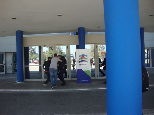 Επιλέξαμε να λούσουμε με κόκκινη μπογιά συγκεκριμένα σημεία στο χώρο, θέλωντας να καταδείξουμε την ευθύνη τόσο της κυβέρνησης όσο και της frontex για τους εκατοντάδες πνιγμούς προσφύγων και μεταναστών στη θάλασσα του αιγαίου. Οπως φαίνεται σε φωτογραφία από την παρέμβαση, ένστολος του λιμενικού σώματος έσπευσε να χειροδικήσει εναντίον συντόφου κατά τη διάρκεια της παρέμβασης, αλλά του κόπηκε γρήγορα η όρεξη.