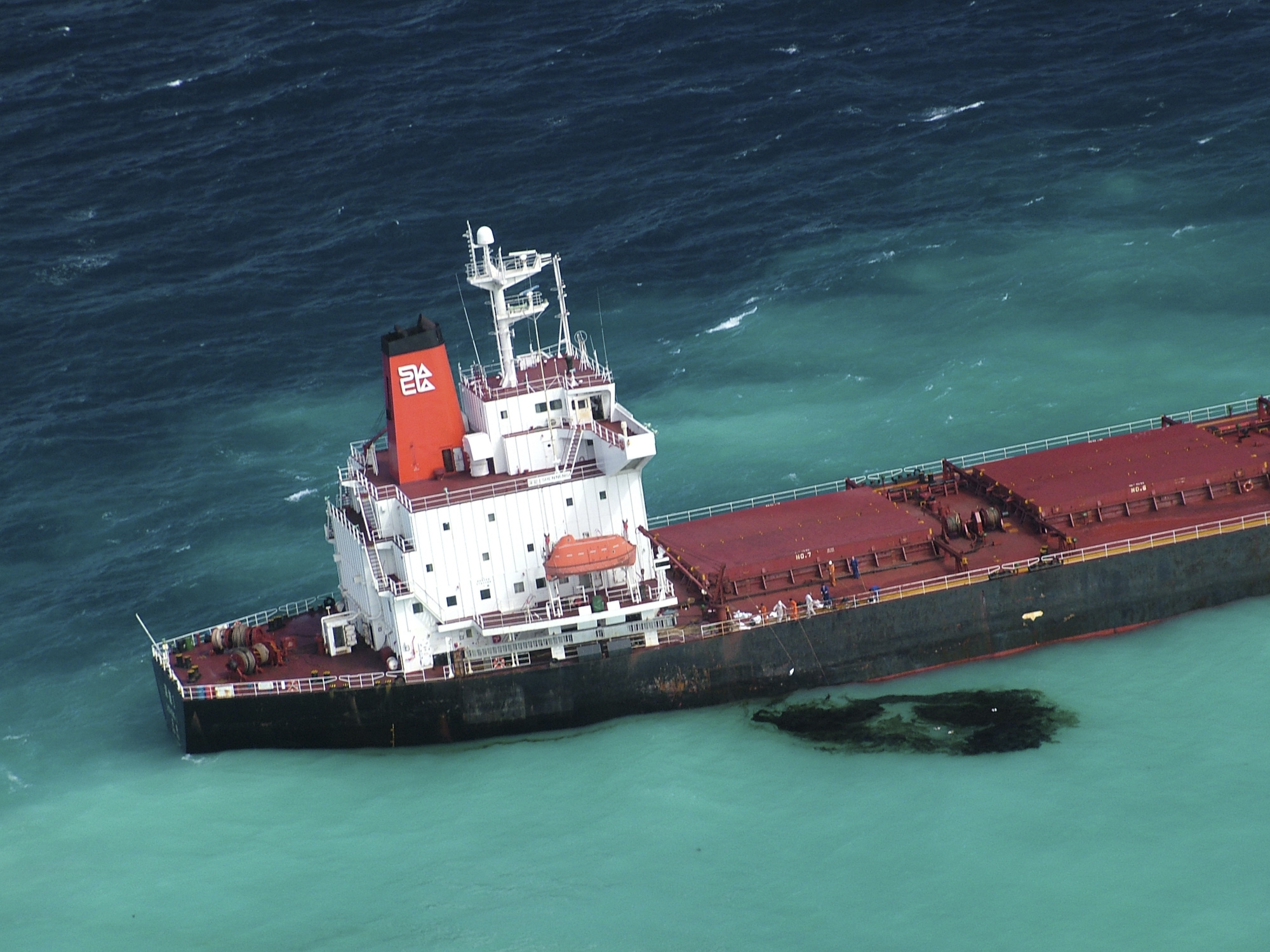 In this Monday, April 5, 2010 handout photo supplied by Queensland Maritime Safety, oil leaks from the Chinese-registered 230-meter-long bulk coal carrier Shen Neng 1st that rests aground on Douglas Shoals off the coast 70 miles east of Rockhampton, Australia. About 2 tons (metric tons) of oil have already spilled from the 1,000 tons (950 metric tons) of fuel on board, creating a 100-yard (meter) slick that stretches 2 miles (3 kilometers), Marine Safety Queensland said in a statement. (AP Photo/Queensland Maritime Safety) ** EDITORIAL USE ONLY **