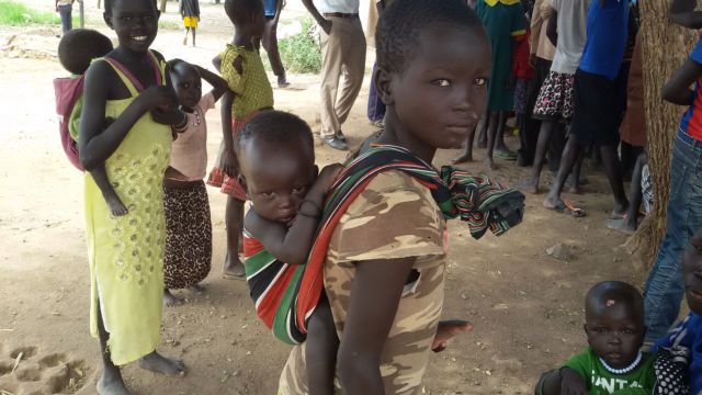 Η Νιαγκόα κρατάει στην αγκαλιά το ενός έτους μωρό της. «Ο πατέρας του παιδιού ζει σε άλλο σημείο του καταυλισμού. Δεν θέλω να επιστρέψω στο Νότιο Σουδάν. Θέλω να παραμείνω στην Κακούμα για να μπορέσει να πάει σχολείο το παιδί μου».