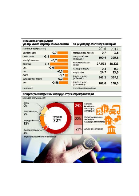 Η Moody’s προβλέπει ύφεση 0,7% εφέτος και ανάπτυξη 1,8% το 2017, με το δημόσιο χρέος που αυξήθηκε κατά 67 ποσοστιαίες μονάδες από το 2008 και ανήλθε σε περίπου 176,9% του ΑΕΠ το 2015 να κορυφώνεται στο 183% του ΑΕΠ το 2016.