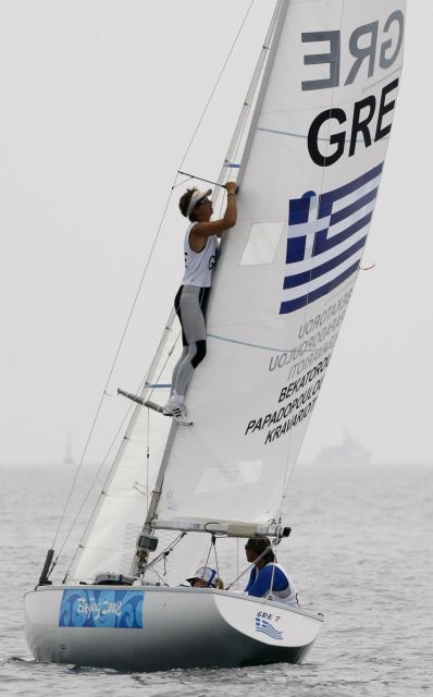 Sofia Bekatorou, Sofia Papadopoulou and Virginia Kravarioti of Greece competing in the Yngling class sail before the seventh race of the sailing competition at the Beijing 2008 Olympic Games in Qingdao, Shandong province, August 13, 2008. REUTERS/Pascal Lauener (CHINA)