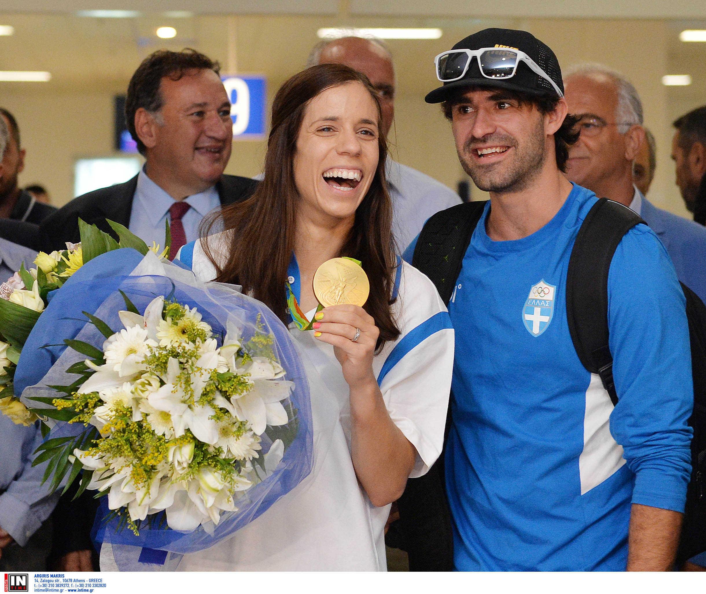 Με ένα πλατύ χαμόγελο και το χρυσό μετάλλιο στο λαιμό έφτασε λίγο μετά τις 16:30 στην Αθήνα η χρυσή Ολυμπιονίκης του Ρίο, στο άλμα επί κοντώ, Κατερίνα Στεφανίδη.