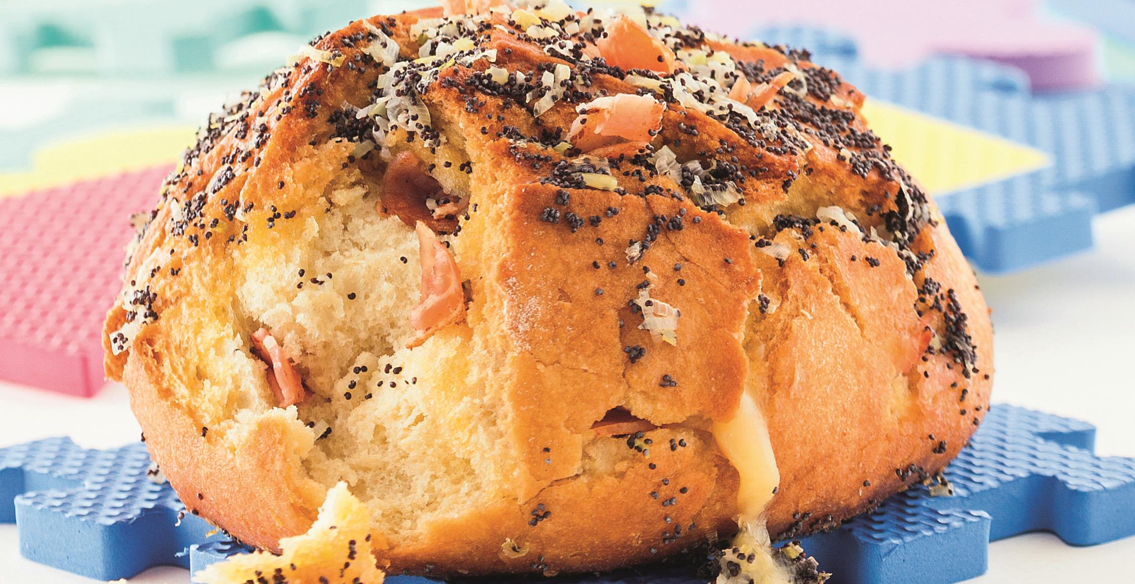 ΕΚΤΕΛΕΣΗΠροθερμαίνουμε τον φούρνο στους 180°C. Με οδοντωτό μαχαίρι χαράζουμε βαθιά το ψωμί κάθετα και οριζόντια, προσέχοντας να μην κόψουμε την κάτω πλευρά του. Γεμίζουμε τις σχισμές με το τυρί και το ψιλοκομμένο μπέικον.