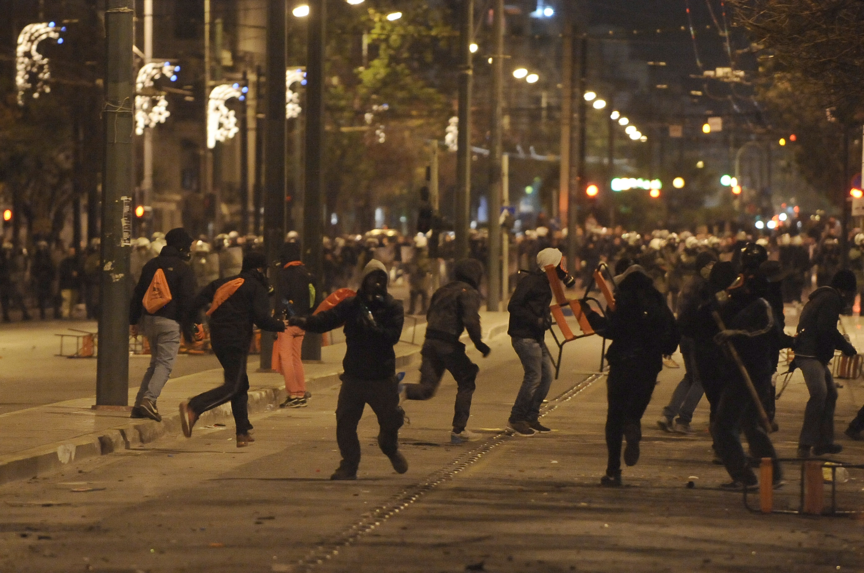 Με την ολοκλήρωση της πορείας για την επέτειο του Πολυτεχνείου (περί τις οκτώ το βράδυ) οι ομάδες νεαρών αντιεξουσιαστών που είχαν καταλάβει χώρους του Ιδρύματος από το απόγευμα της Τετάρτης, έστησαν σκηνικό πολέμου. Με οδοφράγματα απέκλεισαν τις οδούς Στουρνάρη, Τζωρτζ και Πατησίων ενώ είχαν ήδη ξηλώσει μάρμαρα προκειμένου να τα χρησιμοποιήσουν ως πολεμοφόδια εναντίον των αστυνομικών δυνάμεων. Οι οδομαχίες ξεκίνησαν με ρίψη μολότοφ από μεριάς των νεαρών ενώ οι αστυνομικοί απάντησαν με χημικά. Μέσα σε λίγη ώρα τα Εξάρχεια ξαναμετατράπηκαν σε εμπόλεμη ζώνη.