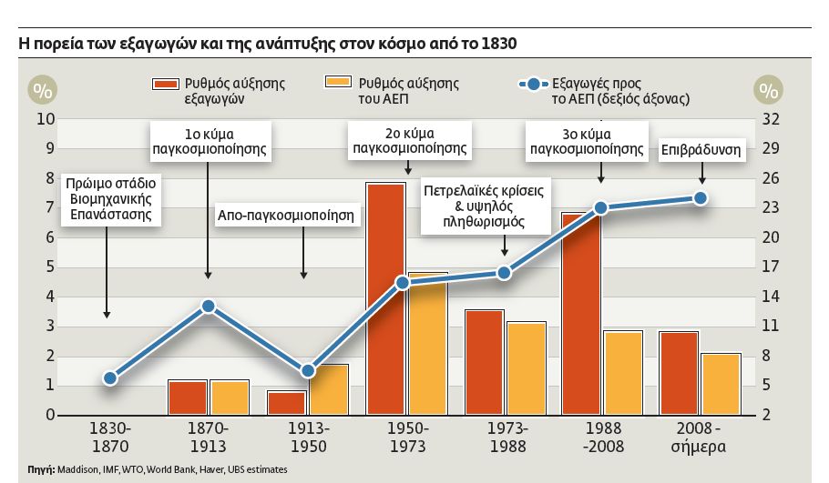 Σύμφωνα με τη UBS, η εποχή της βιομηχανικής επανάστασης αποτελεί τη μήτρα της παγκοσμιοποίησης, ενώ από τη δεκαετία του 1850 ο παγκόσμιος πληθυσμός αυξήθηκε 6 φορές, η παραγωγή 60 φορές και το εμπόριο 140 φορές. Η περίοδος 1870 – 1914 θεωρείται ως το «1ο κύμα της παγκοσμιοποίησης», καθώς το εμπόριο εκτινάχθηκε, αφού ο ατμός αντικατέστησε τα πανιά στις θαλάσσιες μεταφορές και ο τηλέγραφος επιτάχυνε τις πληροφορίες.