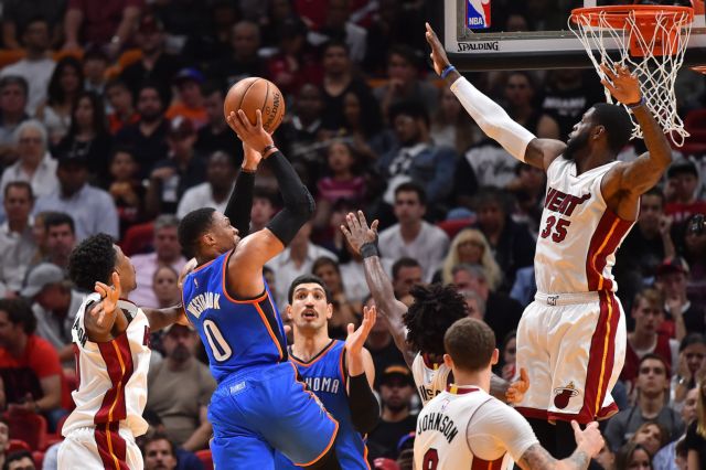 Ο Ράσελ Oυέστμπρουκ πέτυχε το 52ο τριπλ-νταμπλ της καριέρας του (15ο την φετινή σεζόν), οδηγώντας την Οκλαχόμα Σίτι Θάντερ στη νίκη με 106-94 επί των Μαϊάμι Χιτ. Ο ηγέτης της ομάδας της Οκλαχόμα σημείωσε 29 πόντους, 17 ριμπάουντ και 11 ασίστ και ήταν ο βασικός λόγος που οι Θάντερ έφτασαν τις 20 νίκες. Καντέρ και Άνταμς, είχαν 19 και 15 πόντους αντίστοιχα συμβάλλοντας τα μέγιστα στη νίκη. Μόνο ο Ρίτσαρτσον, ξεχώρισε για τους Χιτ, με 22 πόντους.