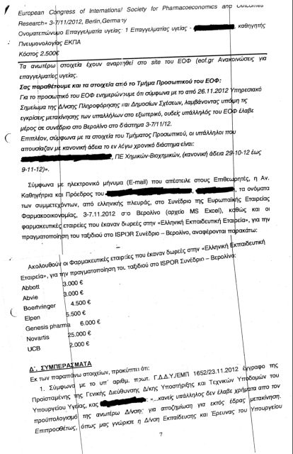 Εγγραφο το οποίο αποτελεί το πόρισμα του υπουργείου Υγείας από τον Δεκέμβριο του 2012 και δημοσιοποιεί «Το Βήμα» ρίχνει περισσότερο φως στην υπόθεση με παράνομα «δώρα» από πολυεθνική φαρμακευτική εταιρεία για να προωθούνται στην αγορά τα προϊόντα της. Σε αυτό αποδεικνύεται ότι 50 πρόσωπα –τα ονόματα είναι στη διάθεση της εφημερίδας -, από τα οποία 10 στελέχη του υπουργείου Υγείας, ταξίδεψαν σε συνέδριο στο Βερολίνο με παράνομες διαδικασίες και με πληρωμένα έξοδα από επτά φαρμακευτικές εταιρείες. Τη μερίδα του λέοντος είχε καταβάλει η ερευνώμενη από την αμερικανική Επιτροπή Κεφαλαιαγοράς, αλλά και την ελληνική Εισαγγελία Διαφθοράς, ελβετική Novartis. Ηδη έχει αποσταλεί αίτημα δικαστικής συνδρομής στις ΗΠΑ από την εισαγγελέα Διαφθοράς κυρία Ελένη Ράικου και στις αρχές του χρόνου θα κληθούν οι πρώτοι μάρτυρες.