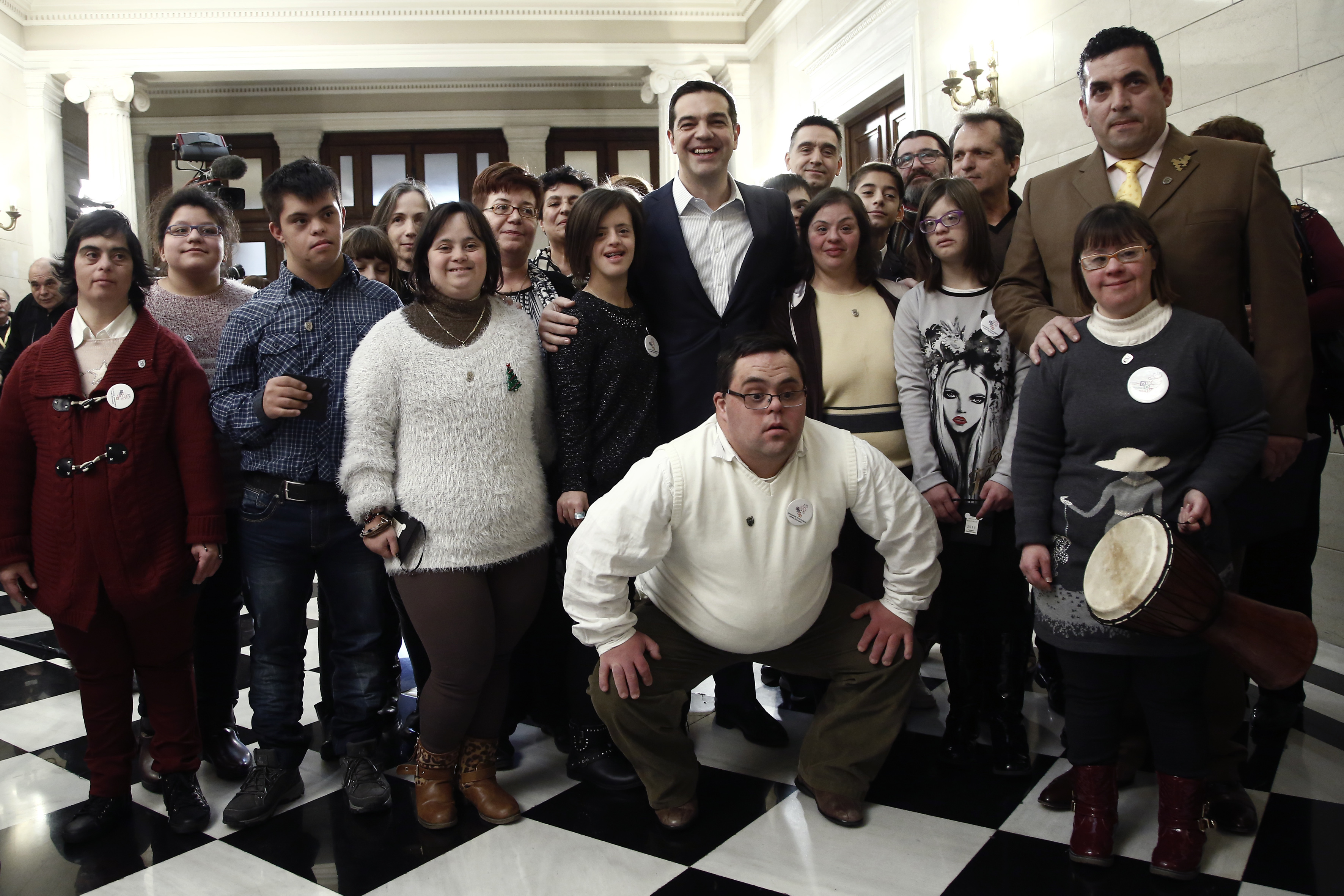 Οι πρώτοι που πέρασαν το κατώφλι του Μεγάρου ήταν τα παιδιά και οι συνοδοί τους, από το Σύλλογο Συνδρόμου Down Ελλάδας, και ο πρωθυπουργός Αλέξης Τσίπρας τους υποσχέθηκε ότι θα τους επισκεφθεί και στην έδρα του Συλλόγου, που είναι στη Θεσσαλονίκη. Ένα από τα παιδιά όμως, φορούσε κονκάρδα του ΠΑΟΚ, γεγονός που έδωσε την αφορμή να ξεκινήσει αθλητική συζήτηση.